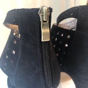 Black suede stiletto heel Just Fab platforms. 5.5” heel, 1.5” platform. Back zip is black with gold pull tab. High reaching straps have perforated holes giving a sexy detail. Great condition. Like new except for bottoms. Super sexy.