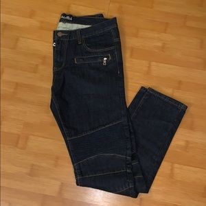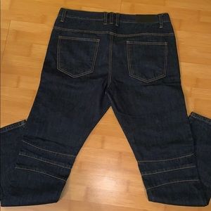 Pre-owned size 34. Indigo wash biker denim. Slim tapered fit. Zipper front pockets. Zipper fly