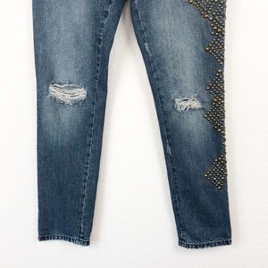 Mid-Rise Style. Rigid denim, Boyfriend style Distressed jeans. Featuring Statement Metal Stud detailing, with each stud put on individually by a machine.