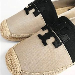 •toe tones navy+gray , canvas, espadrille. T symbol on the front.