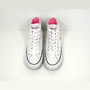 Converse X Hello Kitty High Top Sneakers White & Hello Kitty Pink! Classic Hello Kitty in her blue overalls standing in a field of flowers! Love having kitty on classic cons. ❤️