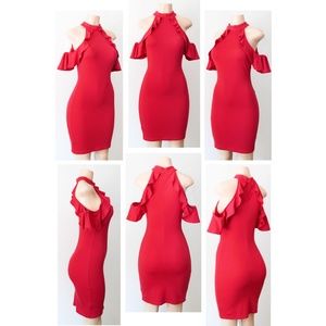 Red Mock Neck Ruffle Cold Shoulder Bodycon Dress