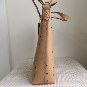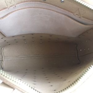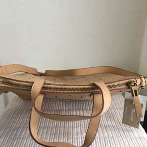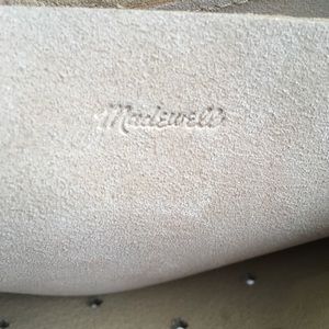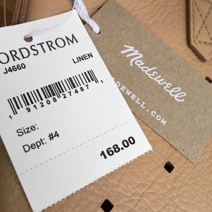 Madewell Mini Transport Perforated Leather Convertible Crossbody Bag NWT $168. Color is called "linen". The longer adjustable strap can be removed making this a shoulder bag. Zip top closure. This is not lined so the perforated holes go all the way through. Single interior pocket.