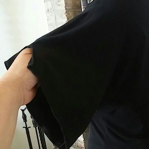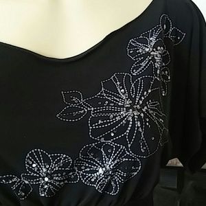 Stunning black party or night out blouse by A.Byer. This blouse is a must for you to turn heads at that night club. This item has short sleeves that are a little wider than usual to give it an extra fabulous look. If that wasn't enough, this item also has a small rhinestone design, creating a flower design, on the left shoulder and coming down the left bust towards the center.