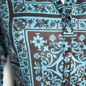 Brown and blue collared, v-neck buttondown. Gorgeous Norwegian style print. 3/4 length sleeves. 100% cotton