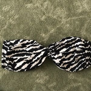 This Victoria’s Secret Zebra White and Black Bikini Top & Bottom is a Size Medium. The top is strapless and the bottom has ties on the sides. They are both a medium. The top has padding inside and a hook in the back for open and closure. It is in great condition!