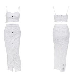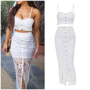 Sexy ruffled two piece set with crochet lace detail. Cropped cami style tank. Midi skirt with lining mini skirt length. Stretches.