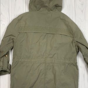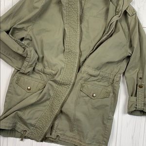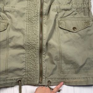 Military army olive green oversized longer jacket. 100% cotton, size small. Has drawstrings on bottom and inside for waist as well. Zipper. 2 big pockets and a hoodie. Cuffed sleeve. Good condition except some fading on the outside of drawstring part on one side (shown in last pic). Purchased from Nordstrom’s