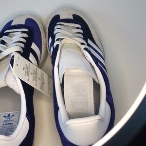 Dressed in a Collegiate Purple, White, and Grey color scheme. This adidas Samba features a plush velvet upper with premium teasel suede overlays. A hidden stash pocket inside the tongue and “420” on the outsoles.