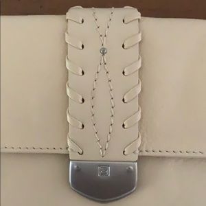 Barely used MICHAEL Michael Kors wristlet in cream. Features braided/embroidered flap and functional back pocket with snap. Convertible strap can turn wristlet into a mini shoulder bag.