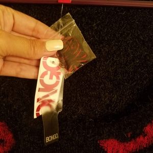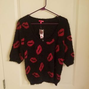 BONGO Womens Large Black Lip Print Fuzzy Sweater
