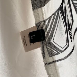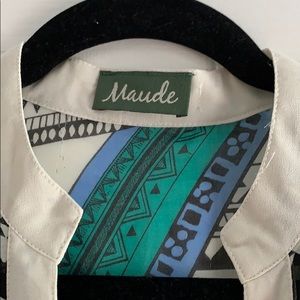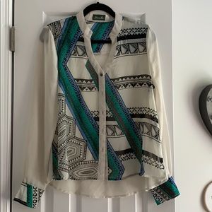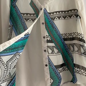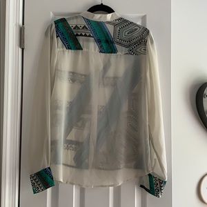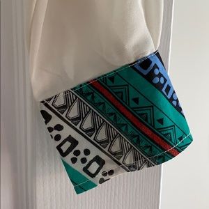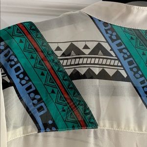 Asymmetrical pattern, high low design, washed but never worn - too small on me! This is a flowy, flattering top that goes great with black pants or jeans. Wear it throughout the year during any season! Cream colored with bright designs on the front and top color area on the back.