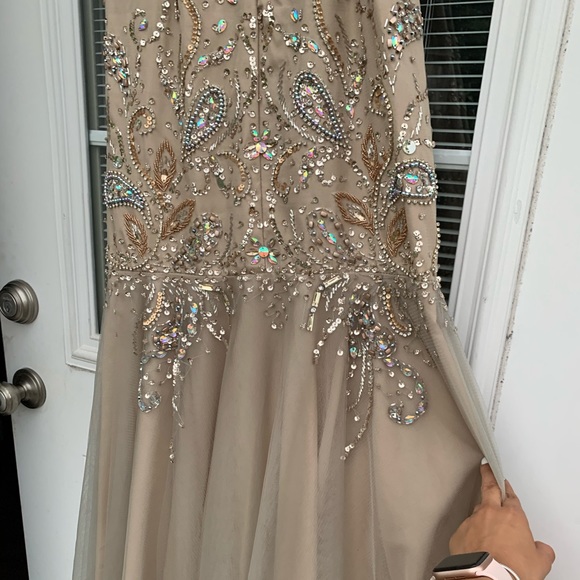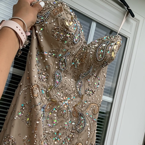 Terani Couture Prom dress, only worn once. Size 0, purchased at Dillard’s. Dress has been altered at the bottom because it was too long for me. I am 5’0 and wearing heels in the pictures. Worn once. There are no tears only some stains on the very bottom from when I wore it. I’ve never gotten it dry cleaned before, I’m sure the stains would come out since they’re from the dress touching the floor. Comes from smoke- free/ pet-free home. Looks beautiful, love all the stones and details on it.