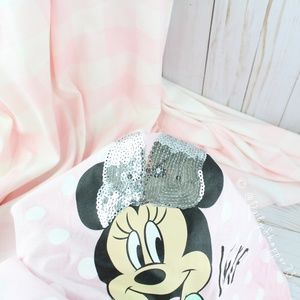 This is a darling Disney Minnie Mouse "I Make the Rules" pajama/lounge tank and shorts set. The night tank has a pink background with white dots and a Minnie Mouse graphic with a silver sequin bow. The shorts have a grey background and a Minnie Mouse with a green bow graphic design. Disney x Primark Exclusive.