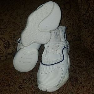 Shoes are brand new never worn all white mesh. Blue elastics to put the all white laces through. Bottom looks like a cloud and are very soft. Size 11