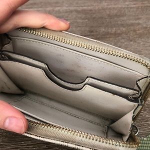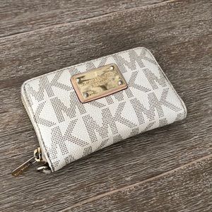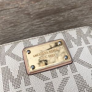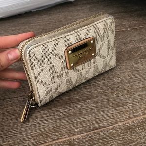 Beautiful wallet! Outside is very clean. Zipper, interior, and hardware show wear. Features the signature Michael Kors Pattern.