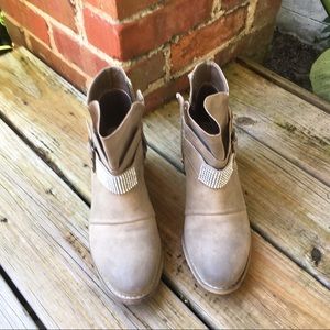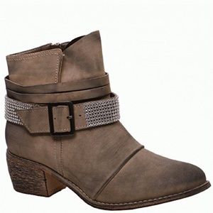 Size 8.5 Pierre Dumas taupe rimini 2 rhinestone booties with 2” chunky heel. In excellent used condition