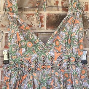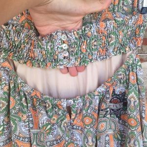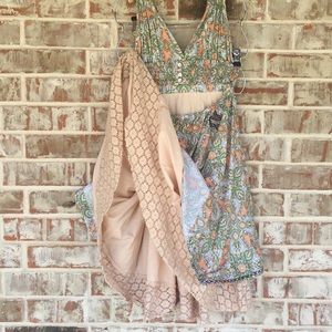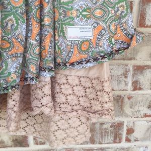 This beautiful dress features multicolor green and orange beige and brown paisley bohemian design. There is handstiched design across bodice and trim. The layered dress has a soft doily lace style ruffle hem peeping out underneath in nude.Halter top style with open back and elastic button up band accent across back. Embroidered “Sovereign” Sheriff Star patch on rear and “celebrating yourself” canvas patch on front.