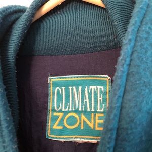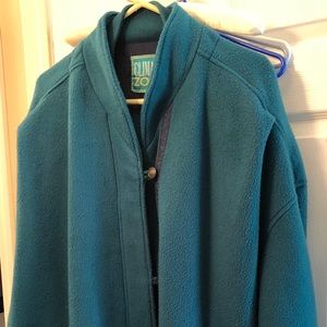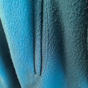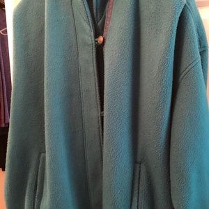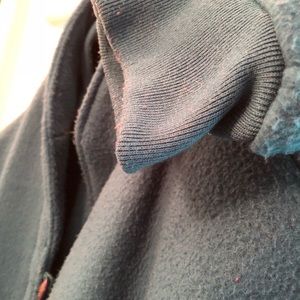 Blue fleece button front slash pockets. Sweater cuffs and chill guard at neck to keep cold out. Shows some wear but has life left in it. Especially at a bargain price.