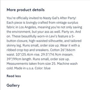 Beautifully worn-in Levi's w/ a 5-button closure, high-waisted silhouette, and tailored skinny leg. Cotton. Each one is vintage and unique so the stock picture is NOT exact. Bella Hadid is wearing Nasty Gal 501 jeans w/different pockets