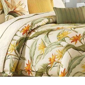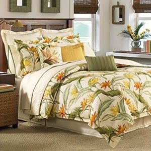 Transform your bedroom into a tropical escape with the birds of Paradise comforter set from Tommy Bahama. The ultra soft cotton comforter and matching shams features a tropical palm design in muted Coconut and green tones with orange and yellow accents. Set also includes a solid cotton bed skirt which coordinates perfectly with the comforters and shams.