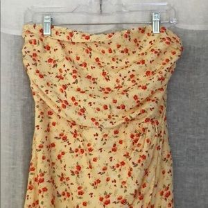 Never worn, brand new Majorelle Genevieve midi dress from Revolve. Soft yellow fabric with red, white, and green floral design. Layered front detail with a ruched strapless top. Zipper on the side. SOLD OUT online!