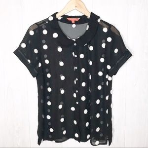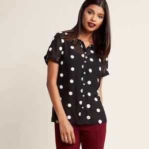 When your bestie calls to consult on today's dress code, you choose "ladylike" with this sheer ModCloth namesake label blouse in mind! Pairing a Peter Pan collar with ribbon-trimmed short sleeves, and patterned with textured ivory dots, this black button up brings vintage-inspired charm into the limelight.