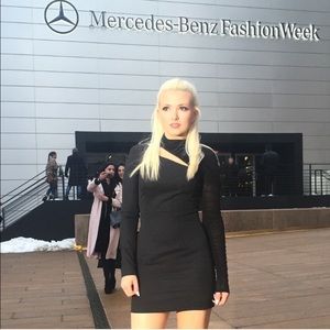 Vintage Pierre Balmain asymmetrical mesh turtleneck cutout long sleeve mini dress. Size Italian size 24 (fits like a US 4).