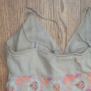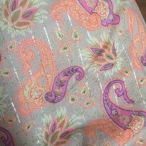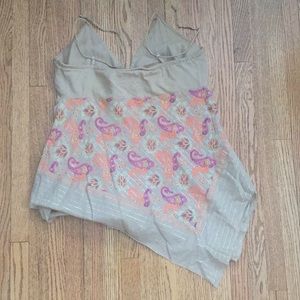 Paisley with silver sparkle handkerchief tank. Spaghetti straps that you tie in back, so it’s adjustable. 2 handkerchief points that cross over in front. One handkerchief point in back. First photo indicates color.