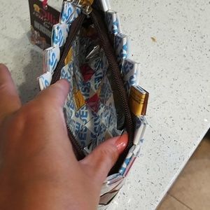 Small Hershey's kiss patterned wristlet. Perfect to hold just the essentials. My phone, lipgloss and debit card fit fine. 7 1/2" L , able to stretch open to 4" but empty is 1" W. It's never been used. Multicolored.