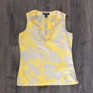 EUC beautiful sleeveless top from Eddie Bauer. Size M. Side zipper for ease of getting dressed. It’s almost sheer so you’d want to wear a camisole under. 60% cotton and 40% silk. Machine wash cold. Golden yellow and warm greige.