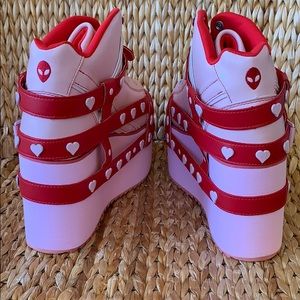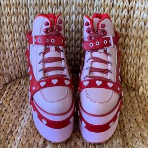 New in box Qozmo Bondage in pink with red bondage straps. Little pink hearts all over the straps that have pink buckles. Pinmnuppers with red stitching, grommets and laces. Also lined in red. So cute!!! 💕❤️💕