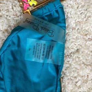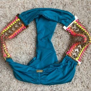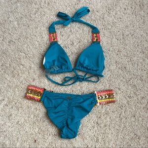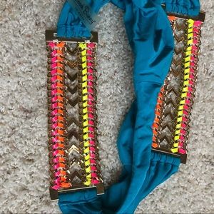 Gorgeous suit for a beach party. Bright blue color accented with Gold Hardware weaved with colorful leather on top and bottom. Triangle top lined with thin removable pads. Bottom lined and back is fully shirred. Top is size med and bottom is XS. Worn only a couple of times. Like new condition!