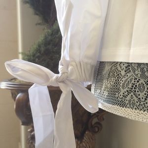 This off shoulder top is offered in our stretch poplin fabric. It drapes perfectly off the shoulder and has feminine tie details at the bottom of the sleeves.