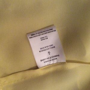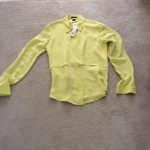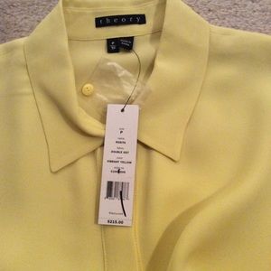 Theory butter yellow silk covered buttoned shirt. Can be worn tucked in or out, casual or dress up. Small hole on upper left sleeve. Please examine pictures carefully. Smoke free home.