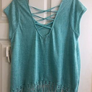 NWT Aqua color top with cross cross on back and fringe along bottom. Size XL Brand new!