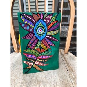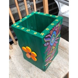 This was a 60s solid wood mid century Vase. I repainted it with the flower/feather detail and added some glass stones. Its one of a kind. Made with my own two hands.