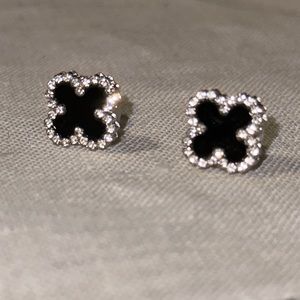 Alhambra clover shaped black and silver earrings studs. stones are 2.5 carat total weight with perfect cut, color and clarity stud earrings. Pierced posts for pierced ears only. Very simple and chic sophisticated style and received many compliments when wearing them. Center looks like black onyx Designer style & luxury taste at a fraction of the price. Get them before someone else does.