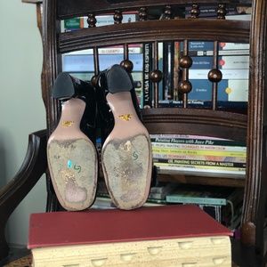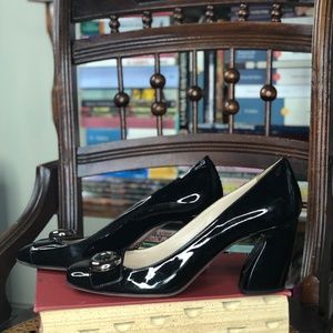 Black patent leather Prada pumps with silver button embellishments at vamps and covered block heels. Light blemishes.