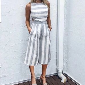 Grey/white striped jumpsuit. Only worn to try on.
