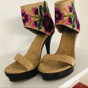 Embroidered Heels Tan with Magenta Flowers