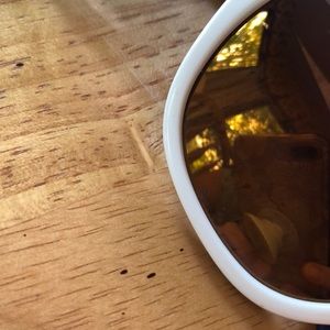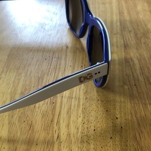 White DG sunglasses with blue interior color. New without tags. Slight scratch at bottom of left lens. See photo. Includes black case.
