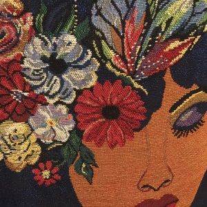 Shoppers tote This gorgeous bag depicts a woman with with beautiful flowers in her hair. It is absolutely gorgeous and better in person. Woven tote bag, 17” h x 16.5”, strap drop 13”