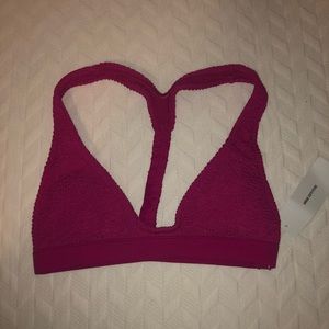 Top: Take the plunge with this textured bikini bottom by Out From Under. Made from a scrunched swim fabric with a plunging v-neckline + thick shoulder straps that lead to a sporty T-back. Lined.