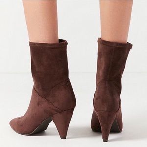 Bring drama to your outfit with these mid calf faux suede boots. Scrunched silhouette, pointed toe and tapered heel.