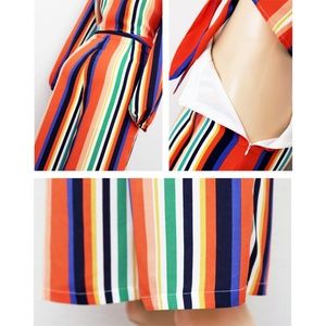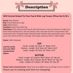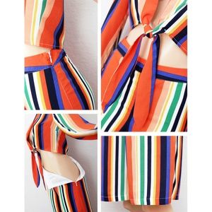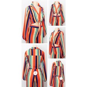 This stripe tie front top & wide leg trouser co-ord set features a bright colorful and bold vertical striped print. Top has classic collar and open tie front, long balloon sleeves with elasticized cuffs. Cropped length. Matching high waisted wide leg palazzo pants. These pants have shorts lined for coverage. Side zipper opening. Woven. Light-weight. You can wear it as matching set or separately, options are endless!