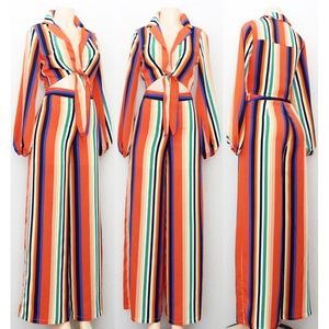 Striped Tie Front Top Wide Leg High Waist Pant Set