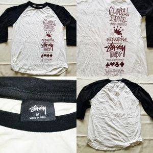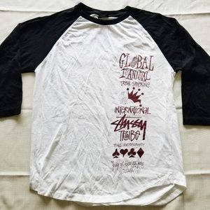 Rare Limited Stussy Global 1st Annual Baseball Style Longsleeve tee in good condition as you can see from pictures it does havea stain towards the top of the neck.. I Added multiple pictures to show condition and measurements. Don't forget to check out my other items for sale. If you have any questions please feel free to ask. Willing to create bundle for discount on price and shipping.