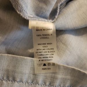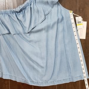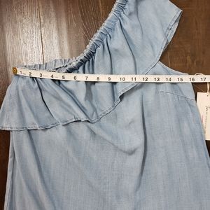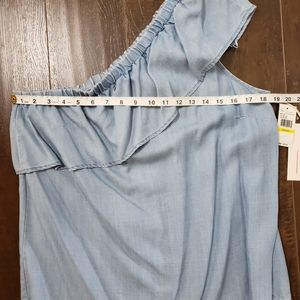 Two By Vince Camuto chambray One shoulder ruffle top with elastic top hem, blue. Light flowy top in a slightly faded denim look. Multiple sizes available.