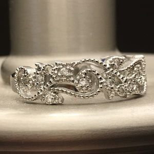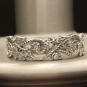 Silver plated ring with gem accents.